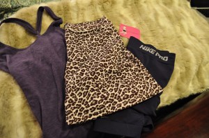 I have been thinking about what to wear for the race and wasn’t coming up with any good answers. I really loved the RunningSkirts brand skirt that I wore for the Tower 10 Miler since the little side pockets were super convenient for holding my Clif Shot Blocks. I used to keep them in my iFitness belt but I find it a little tough to zip and unzip effectively without stopping. The velcro closure of the skirt’s pockets were perfect for keeping the blocks secure but were super easy to access. Then is saw leopard print and the deal was sealed.
