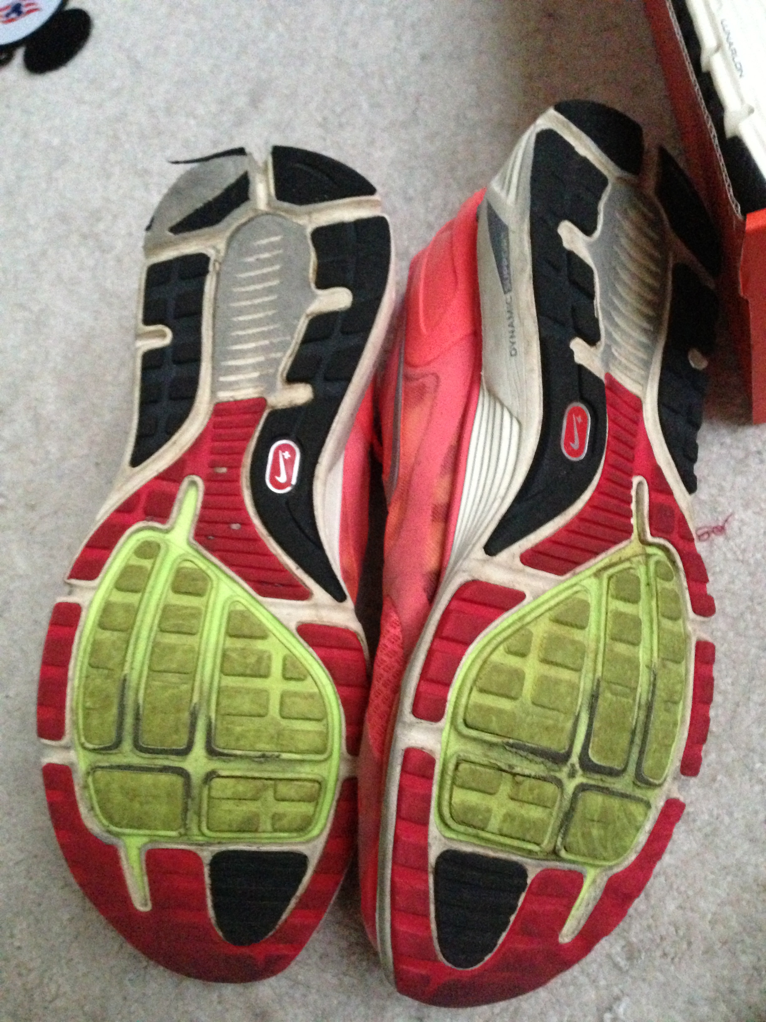 It’s time to retire my first pair of hot pink Nike Lunareclipse+2’s! While I shouldn’t be too sad (since I have two identical new pairs in the closet in my spare bedroom), anything new requires a bit of adjustment. These babies have been with me for a whole 516.2 miles according to the convenient shoe-tracker feature in the Nike+ online interface.