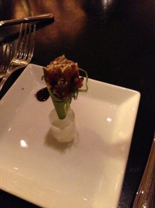 It was an evening filled with laughter, fun, excellent service, and superb food. Our meal started with a delicious amuse bouche of rare tuna in an adorable cone. I’m no foodie so I thought this was super fancy!