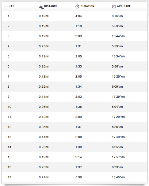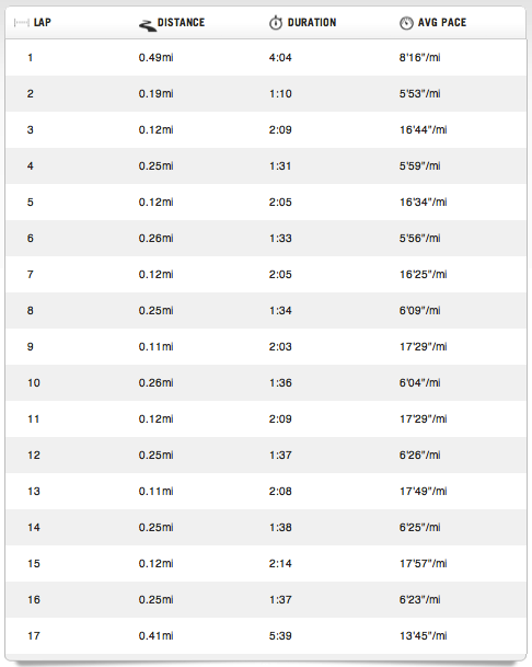 I think I did a great job for my first track work out. I stuck with a few of the men who were running my same pace and I was able to pretty much sustain a solid pace/effort for the whole workout…which felt really hard but a good kind of hard. As you can see from my laps below, I got about 1 second slower with each fast interval but I stayed pretty even for my first time. (By the way…I love you new white Nike+ watch – hopefully your instant pace is better than the last one):