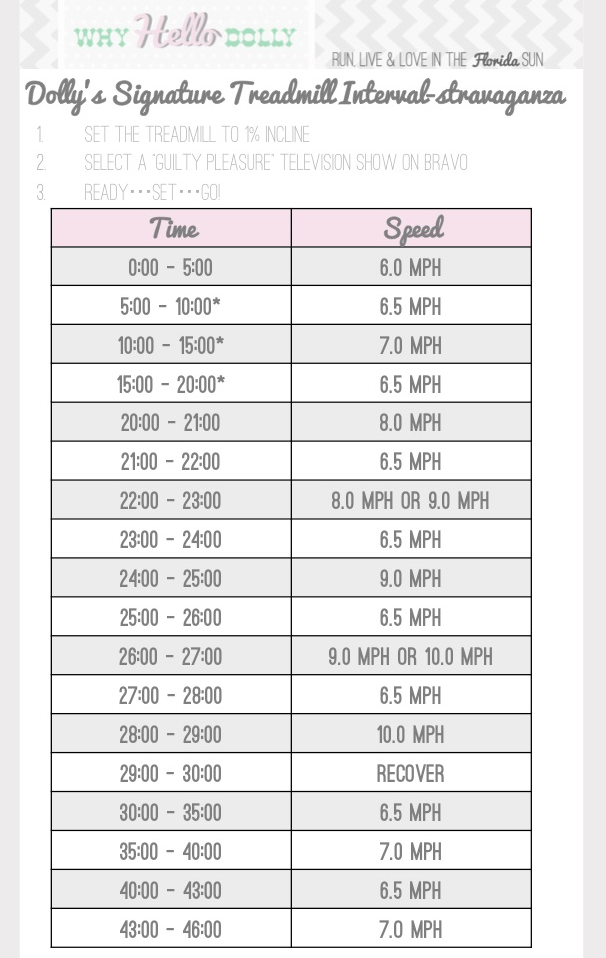 I added speed work to my routine for the first time probably 6-8 months ago. I was finally convinced that this was the best way to get faster but wasn’t quite sure how to go about it at first. Because my running group’s track workout generally conflicts with a class I take at my gym on Tuesday nights, I decided to move my speed work to another night and get it in on the treadmill. This marked a change in my attitude towards treadmills. Previously, I had blamed the treadmill for causing shin splints early in my running and swore off them completely for the last 2 years or so. As I cautiously started to do some treadmill interval training workouts that I found online, I started to gain more confidence about using the treadmill as a training tool. I actually sort of like my 1 day a week max on the treadmill. The intervals make the time pass quickly, I can knock out 5-6 miles with relative ease, and I get to watch some trash TV like the Real Housewives while I do it. Win-Win-Win. Here’s a look at my typical Treadmill interval routine: