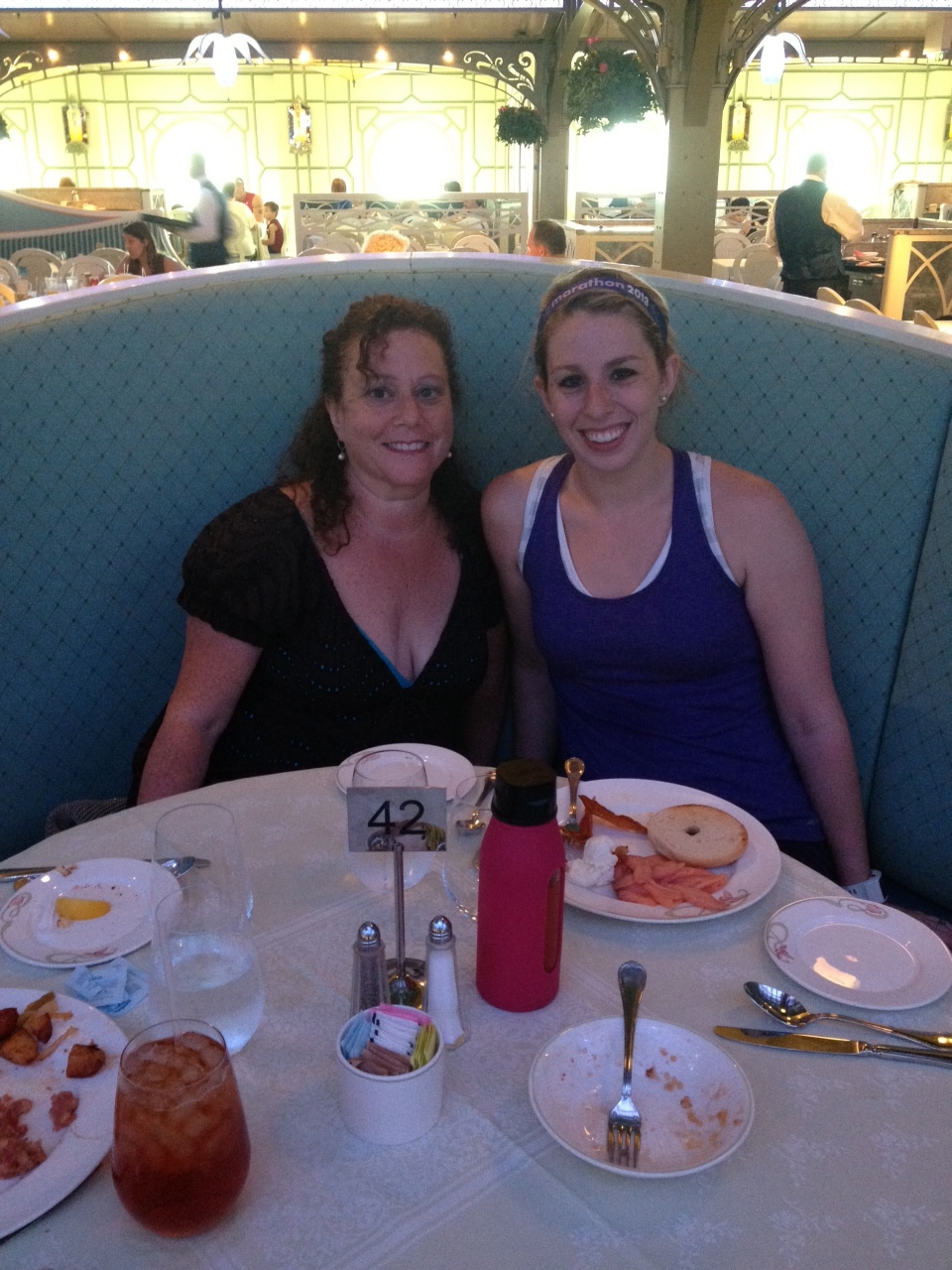 We got a little bit of a late start on the race (since the ship was a bit late pulling into port) so I was worried about missing the “breakfast date” I had set with my mom. As soon as I crossed the finish line, I started my cool down run from the start/finish to the ship which is just shy of a mile. We decided to do breakfast at the Enchanted Garden which was such a fabulous idea! It is such a pretty setting and was nice and quiet. We also got to sit in one of the fun booths we had admired the night before.