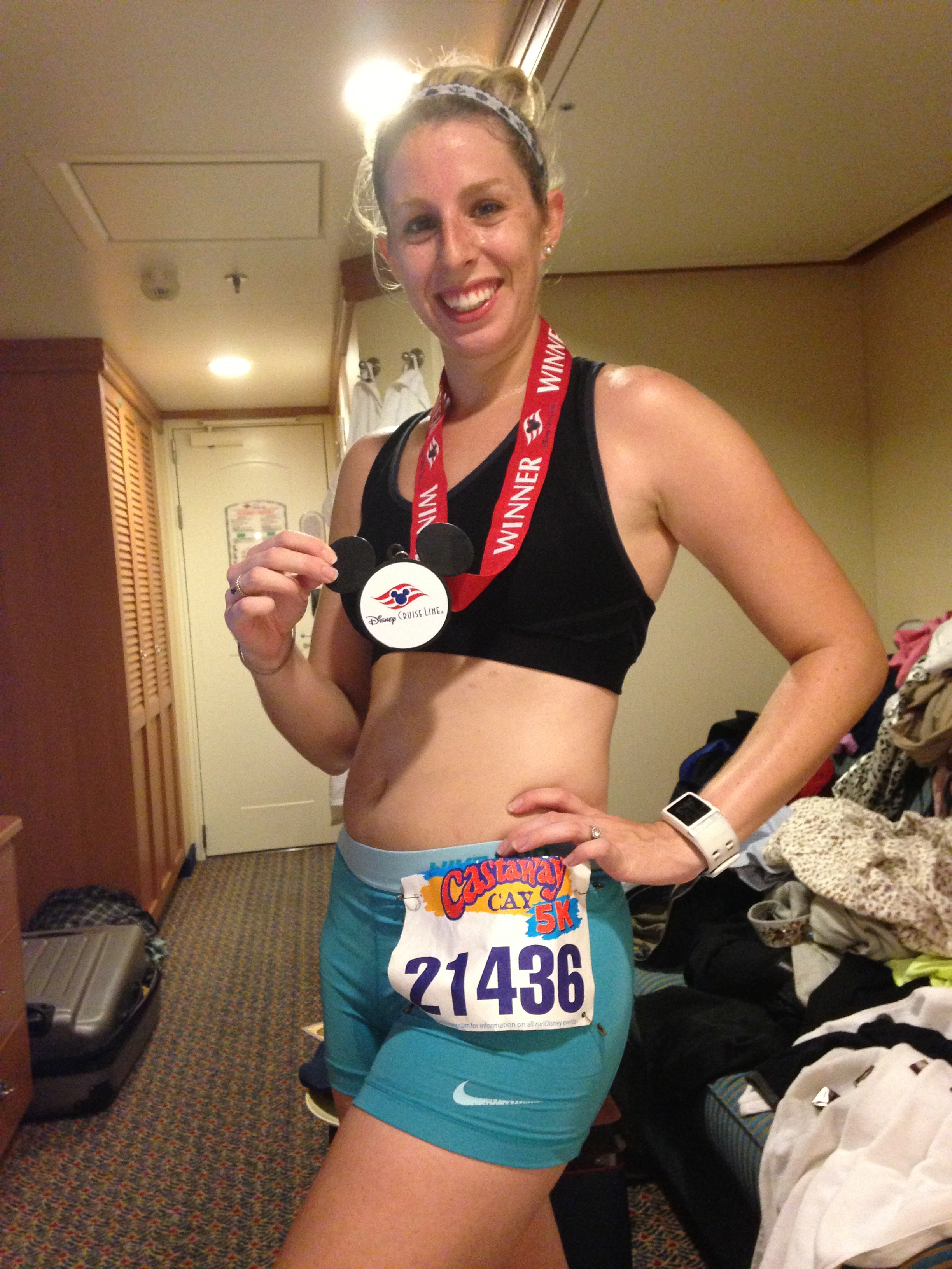 I was actually able to really maintain my mileage thanks to the treadmill on board. While I think one long run ended up being sacrificed, I think I logged 5-6 miles all but one day of the trip. This definitely helped to stave off a major weight gain because, believe me, I really ate on this vacation! I also ran the Castaway Cay 5k again and had another great race! I finished in 23:45 although I think the distance was just shy of 3.1 miles. I finished as the first female and 2nd place overall. Plus seriously, who doesn’t love running on Castaway Cay (minus the blistering heat).