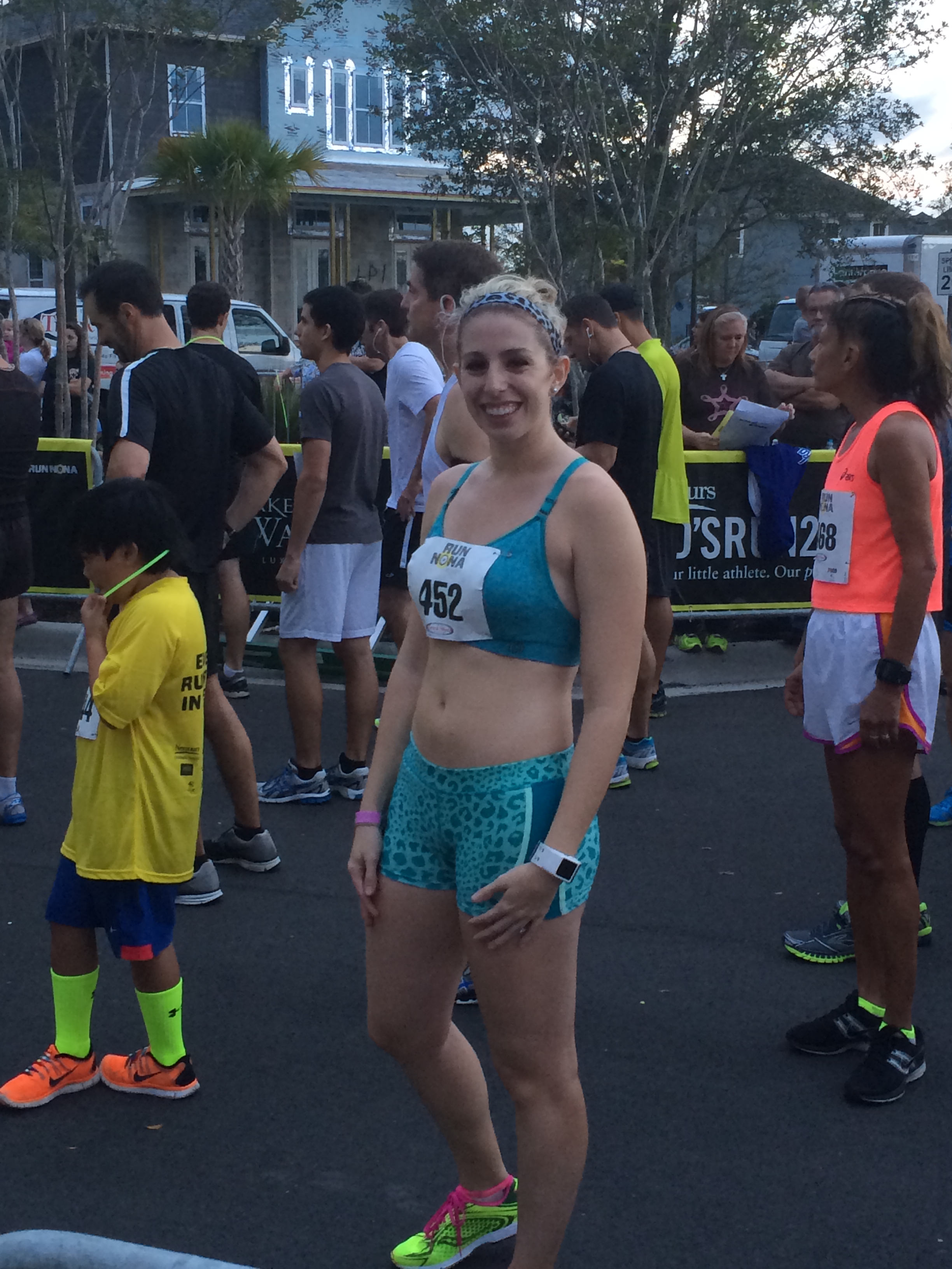 How could I possibly pass up a great opportunity to race right in my neighborhood? I was originally going to run to the start from home as my warm up but after doing a test run earlier in the week, I realized it was about a mile and a quarter to the start which was just a bit longer than ideal for a warm up. My friend Marci came out to race as well so we hung out with our husbands and we got ready for the start.