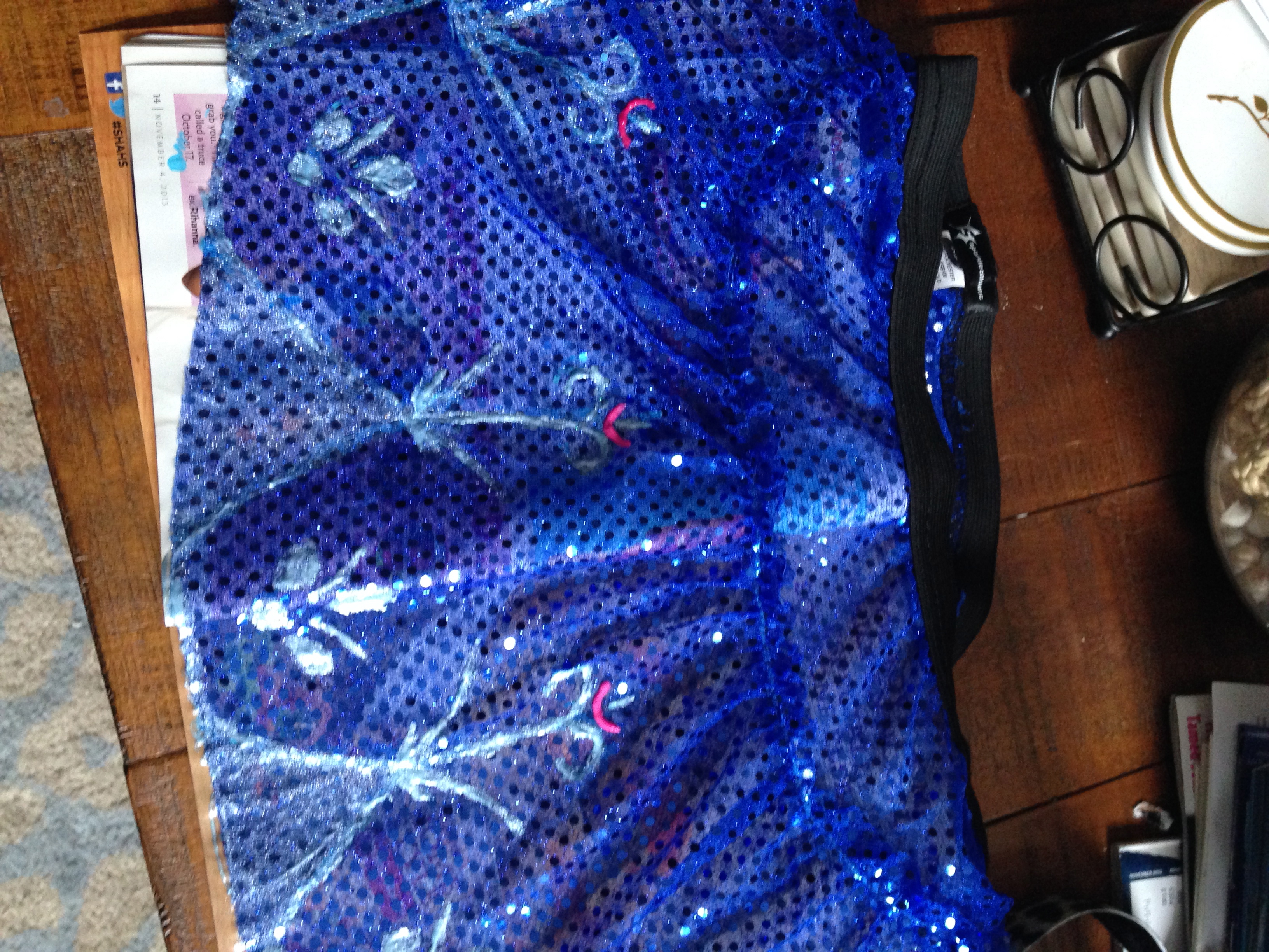 IMG_5351The skirt fit well and then it was time to start the painting process.  Although the Sparkle Athletic skirt is fabulous, I soon found out that the material is almost a sort of very tight mesh that definitely lets the paint bleed through.  While this was not an issue, it did mean that news paper, magazine, or another disposable painting backdrop is a must.  Although the paint dried the skirt to the paper (which then needed to basically be torn off), it seemed best to leave the skirt to dry on the paper.  When I tried to remove the skirt from the paper while wet, it did not allow the little bit of puff paint to remain visible (it bleeds through to invisibility otherwise).